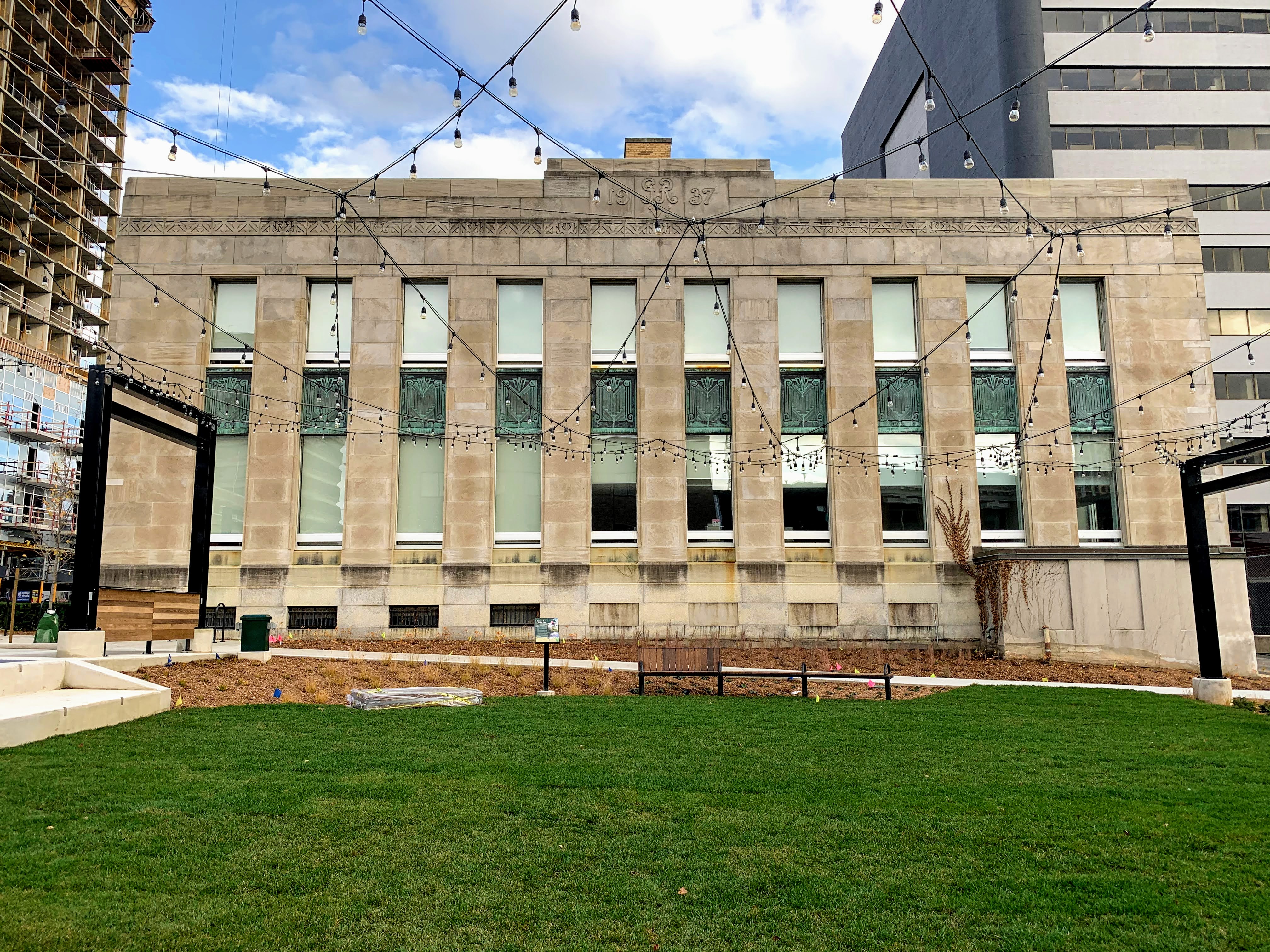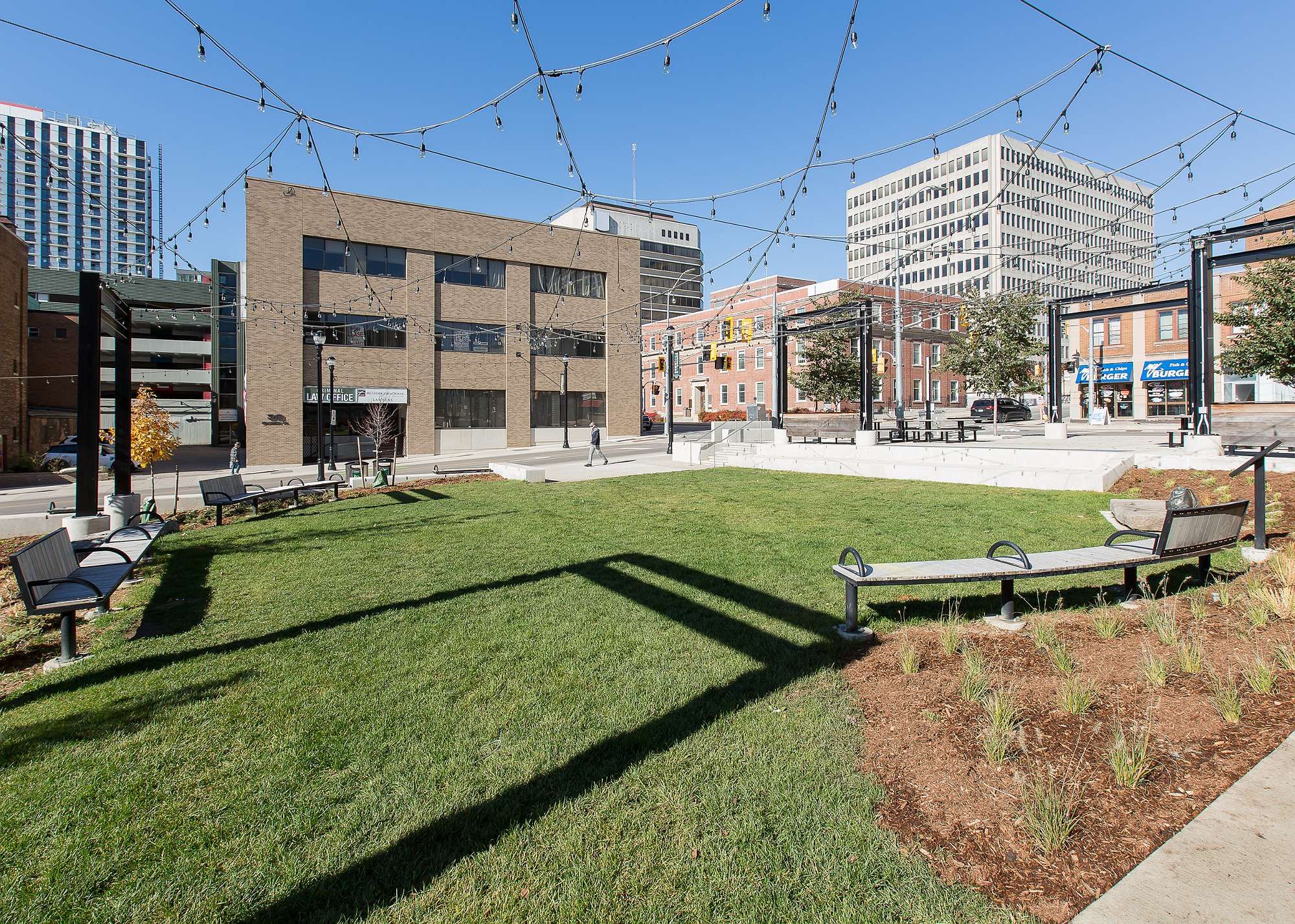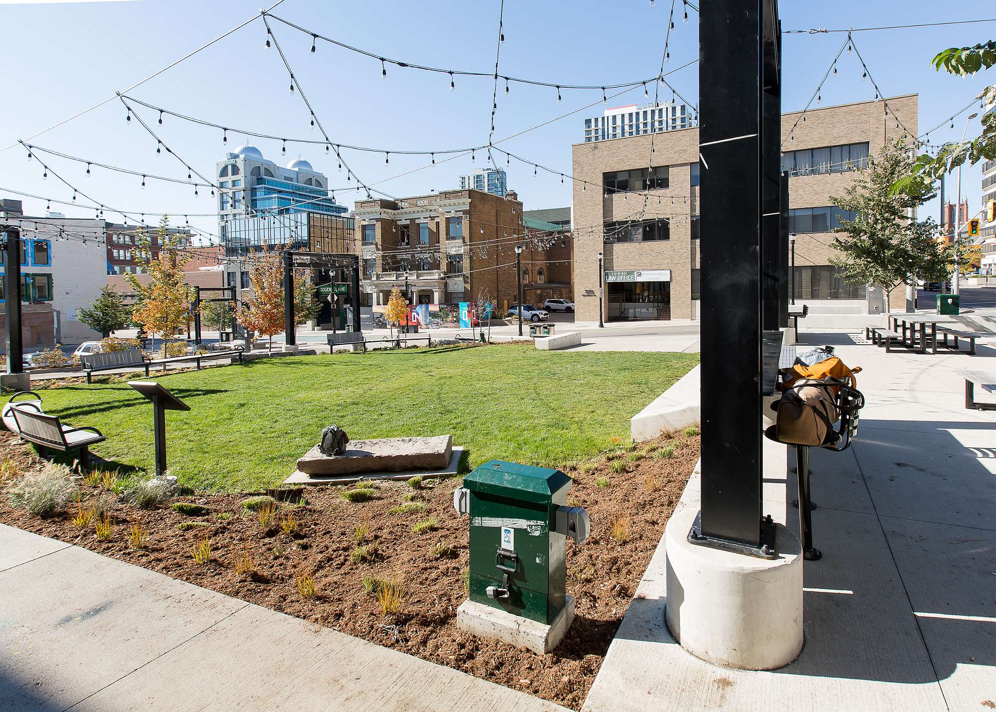 This two-city-led placemaking project highlights the charm of this historic street with many incredible design details. Sprawl out on the grass for a picnic, bring your pups for a meet-cute or use the built-in tables as an outdoor office.